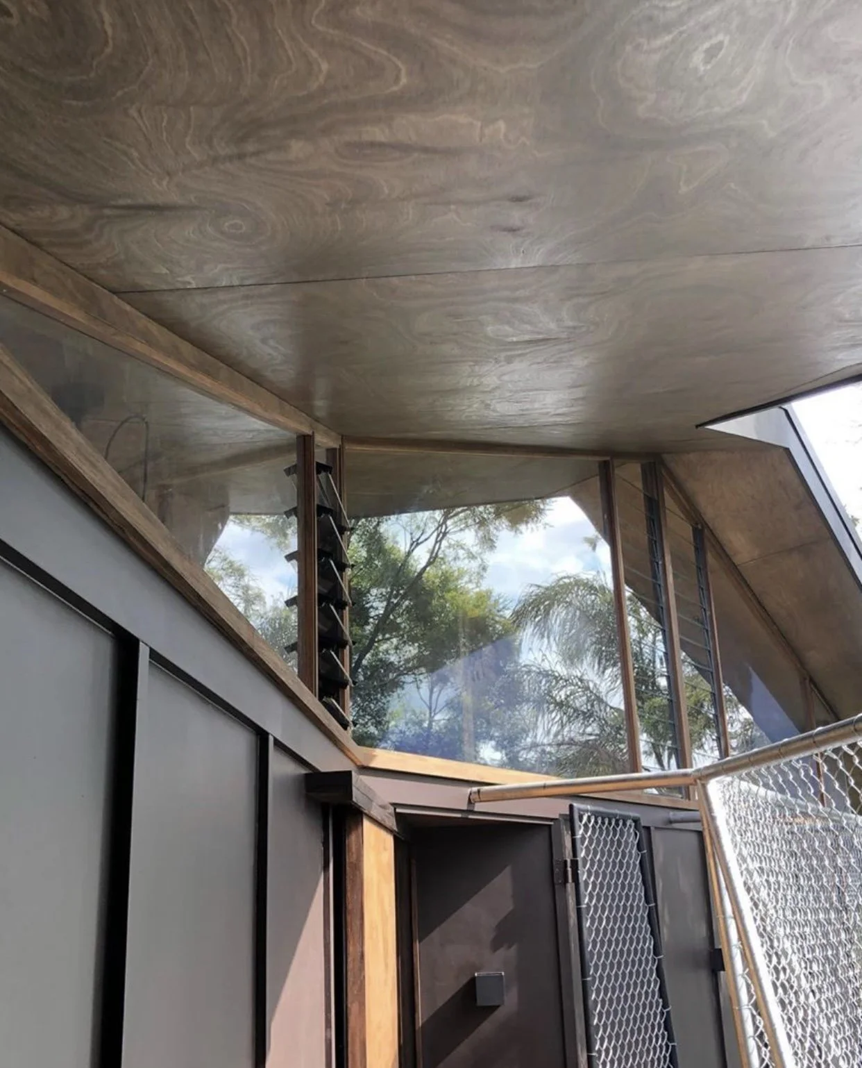 A narrow ‘floating’ folded roof with high level glazing around the full perimeter with no obvious vertical and lateral support. A mesh screen surrounds the structure that serves as a vine trellis and forms the fall protection to the addition.